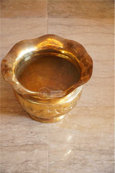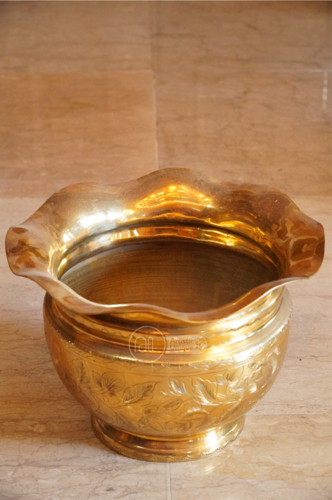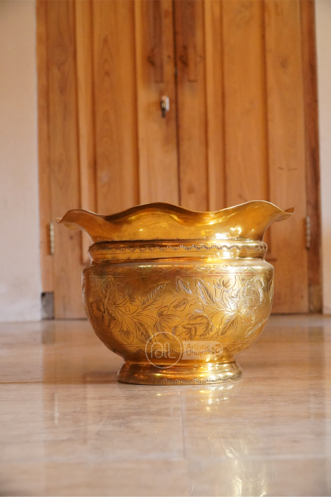 Guci kuningan, dengan keindahan alami dan kemewahan materialnya, menjadi medium yang sempurna untuk dihiasi dengan ornamen kuningan. Setiap goresan dan detil ornamen menggambarkan keahlian dan ketelitian tangan-tangan terampil yang menciptakannya. Dari motif-motif klasik yang terinspirasi oleh warisan budaya hingga desain modern yang inovatif, ornamen kuningan guci menghadirkan keindahan yang tak tertandingi di setiap ruangan.